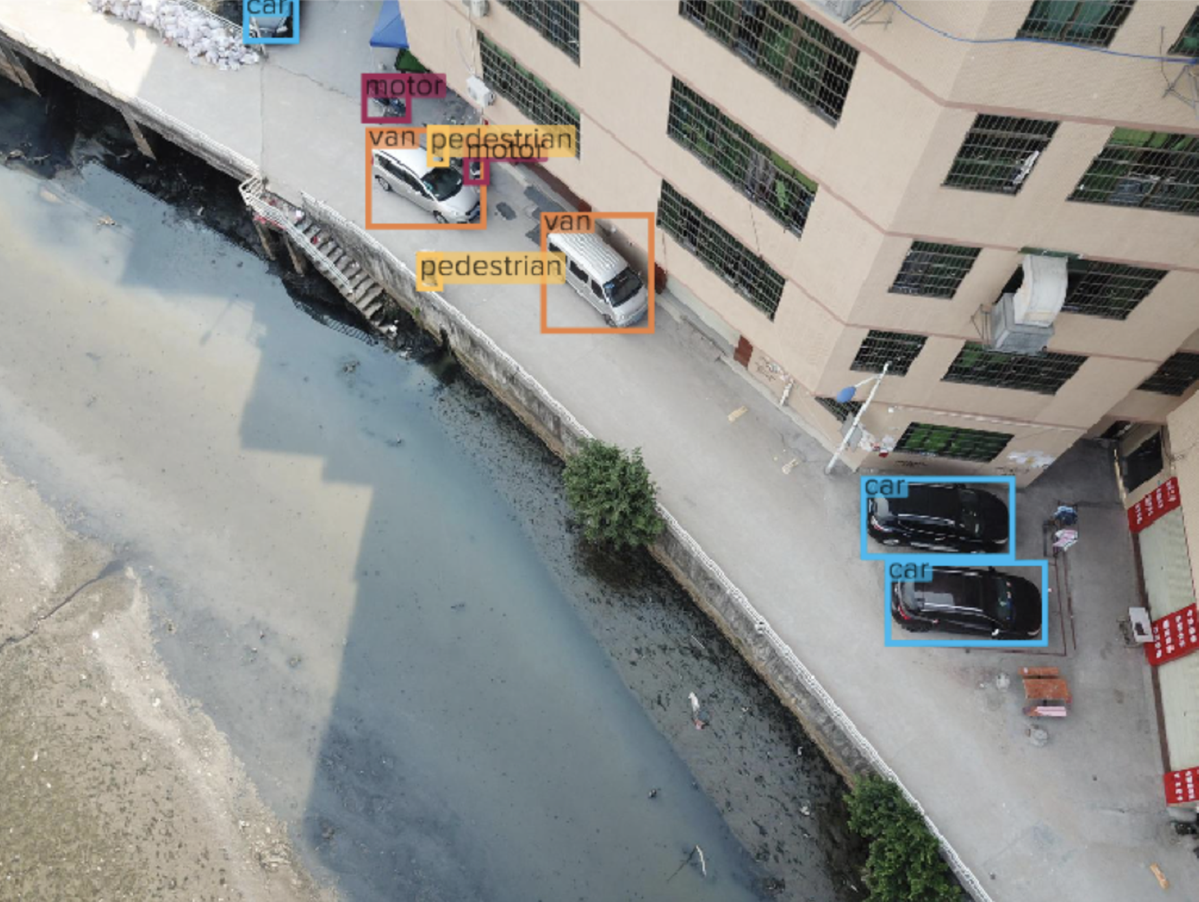 Suppose we are building a surveillance system to count and classify vehicles in small-to-medium size parking lots. The visdrone dataset is suitable starting point because it contains a variety of images of vehicles taken in cities using a UAV. However, many images are taken from very large viewing distances, thus resulting in small objects that are difficult to detect in object detection models, and are also not relevant to our surveillance application, like the image below.