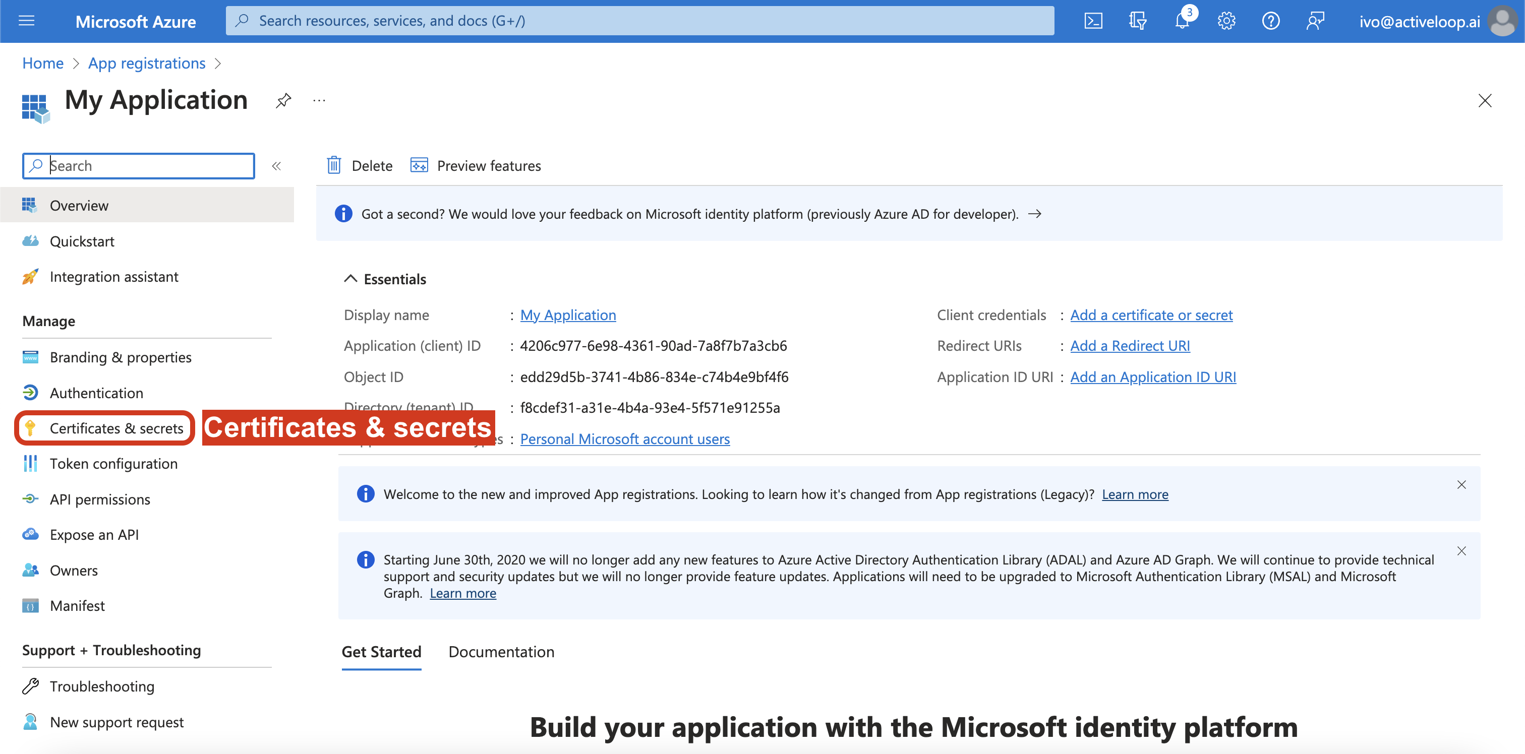 5\. In the application console, click `Certificates & secrets`. &#x20;