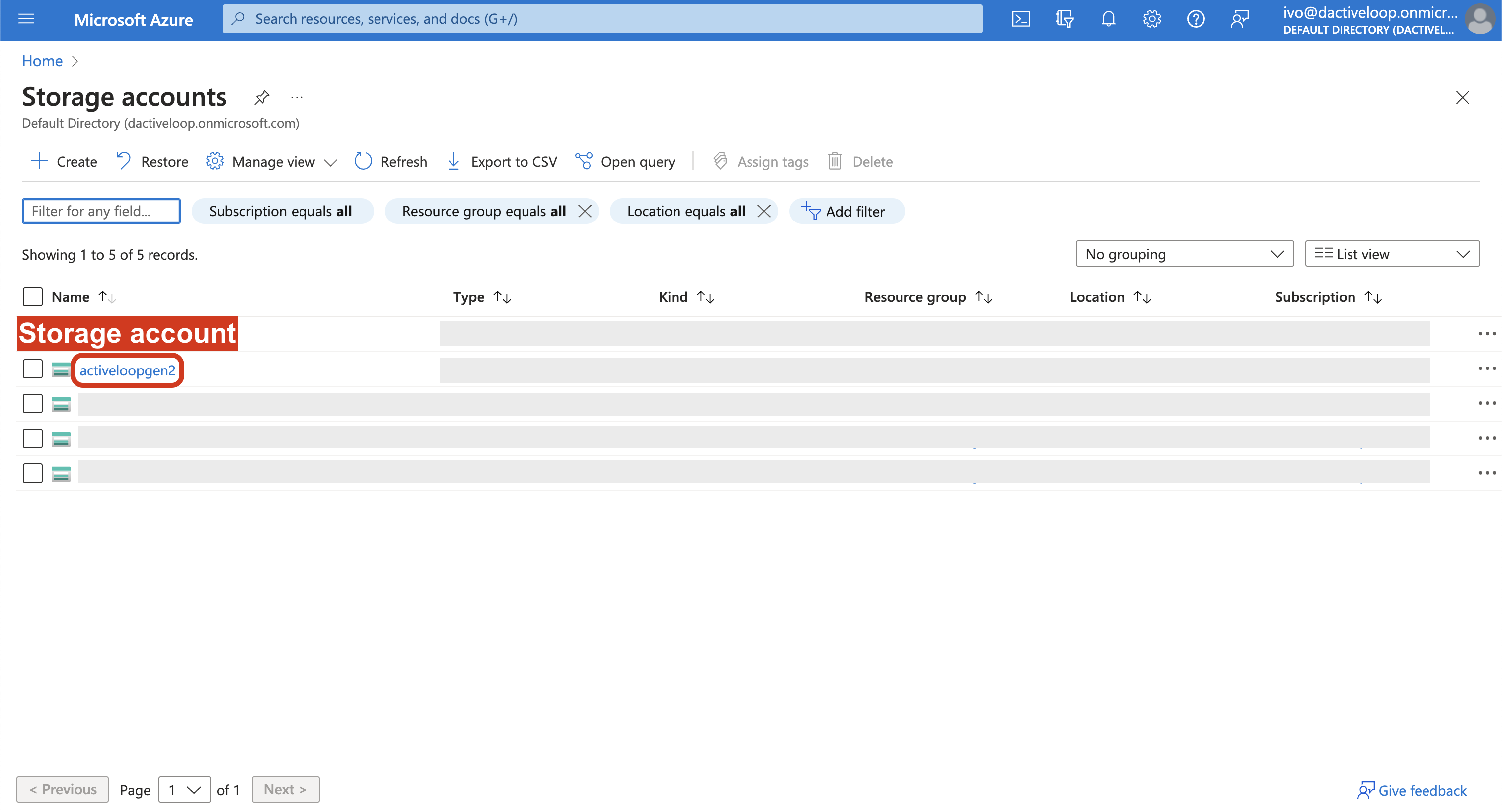 1\. Go to the `Storage accounts` page in the Azure UI, which can be done by searching "Storage accounts" in the console.