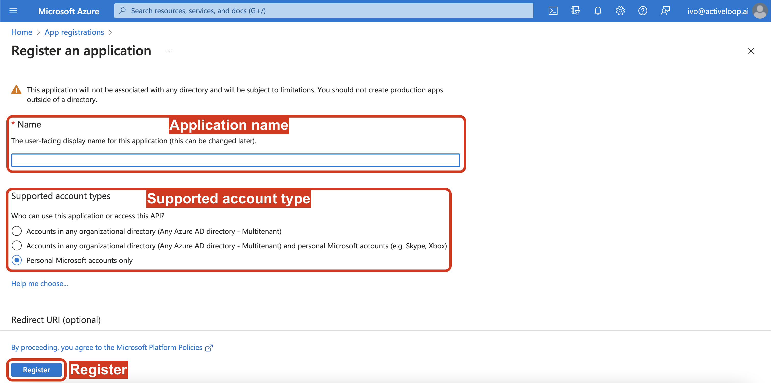 4\. Enter the `Name` and `Supported account type` (all are supported in Deep Lake) and click `Register`