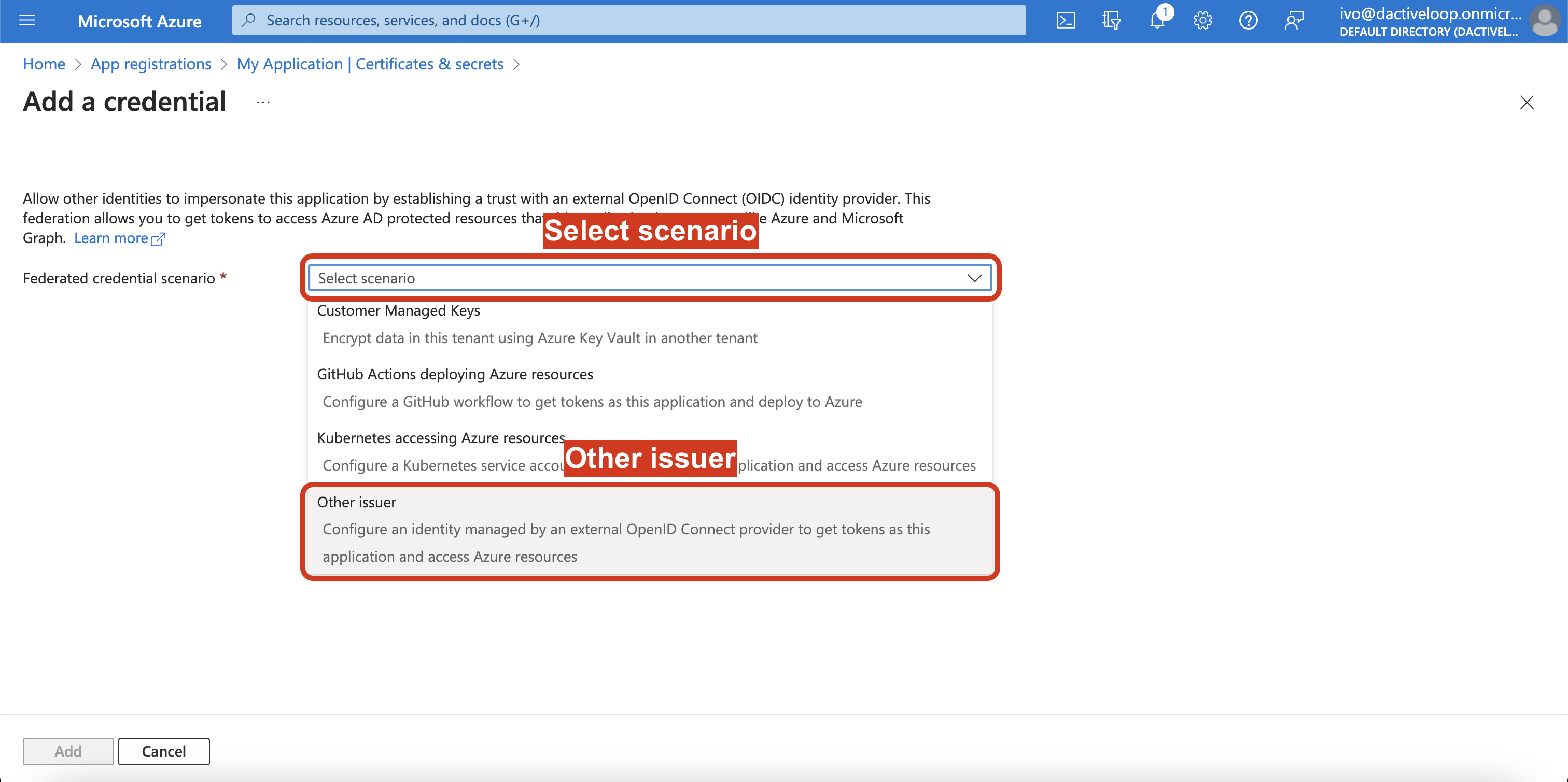 6\. Click on `Federated credentials` and `Add credential`.
