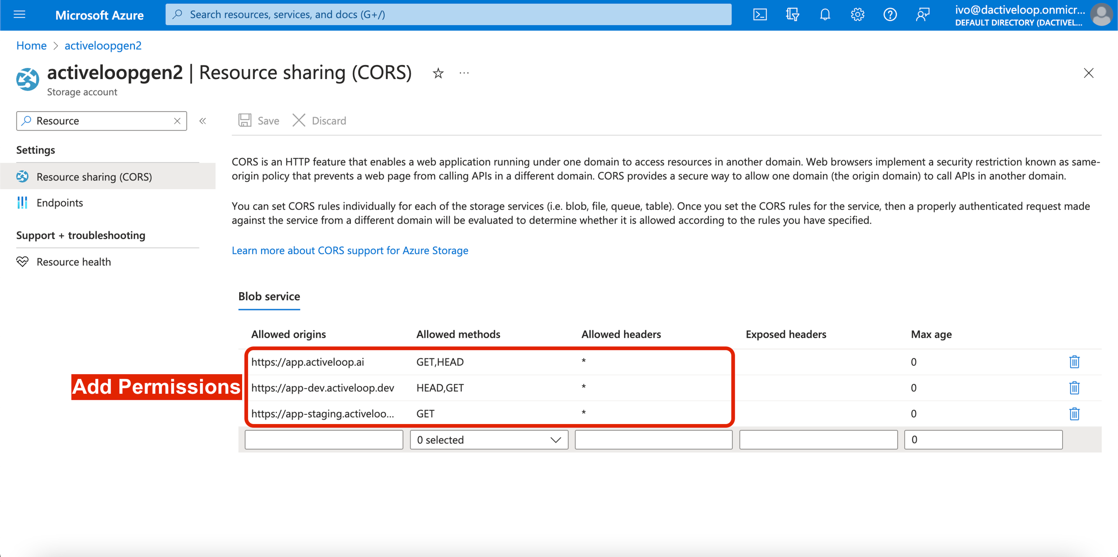How to enable Cross-Origin Resource Sharing in your Azure account.