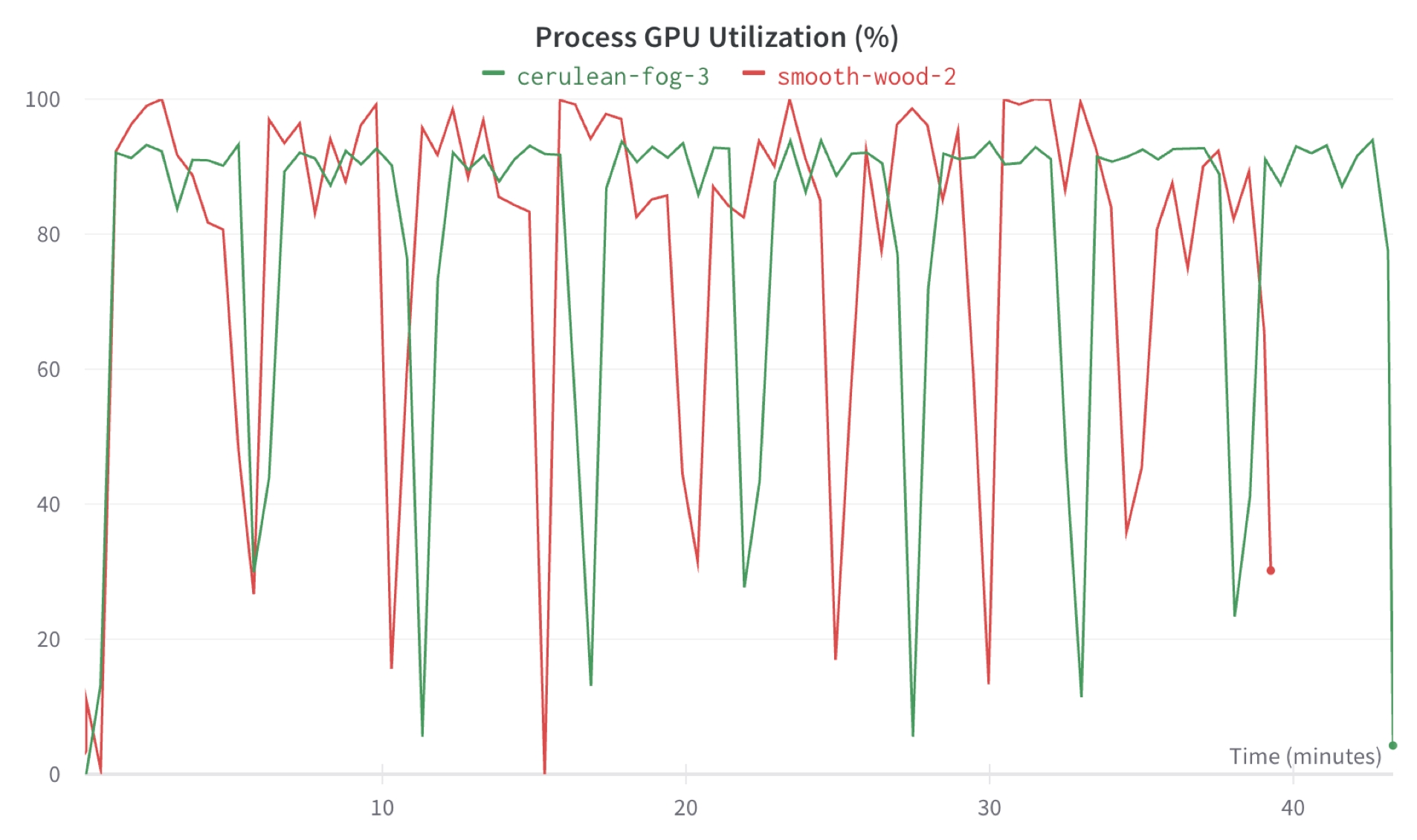 Using W&B automatic logging of CPU and GPU performance, we observe that the GPU utilization for the training runs on this Tesla V100 GPU was approximately 90%, aside from the dips between epochs when the shuffle buffer was filling. Note that the data was streamed from Activeloop storage (not in AWS) to an AWS SageMaker instance. This is made possible by Deep Lake's efficient data format and high-performance dataloader.