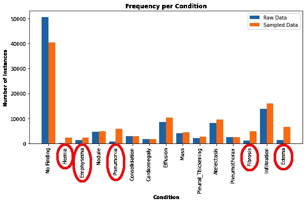 The data in the upsampled dataset has much better representation of the rare conditions. Note that since a given image may have multiple conditions, and since conditions can be correlated, upsampling by one condition may implicitly upsample another condition, if they tend to occur in the same image.