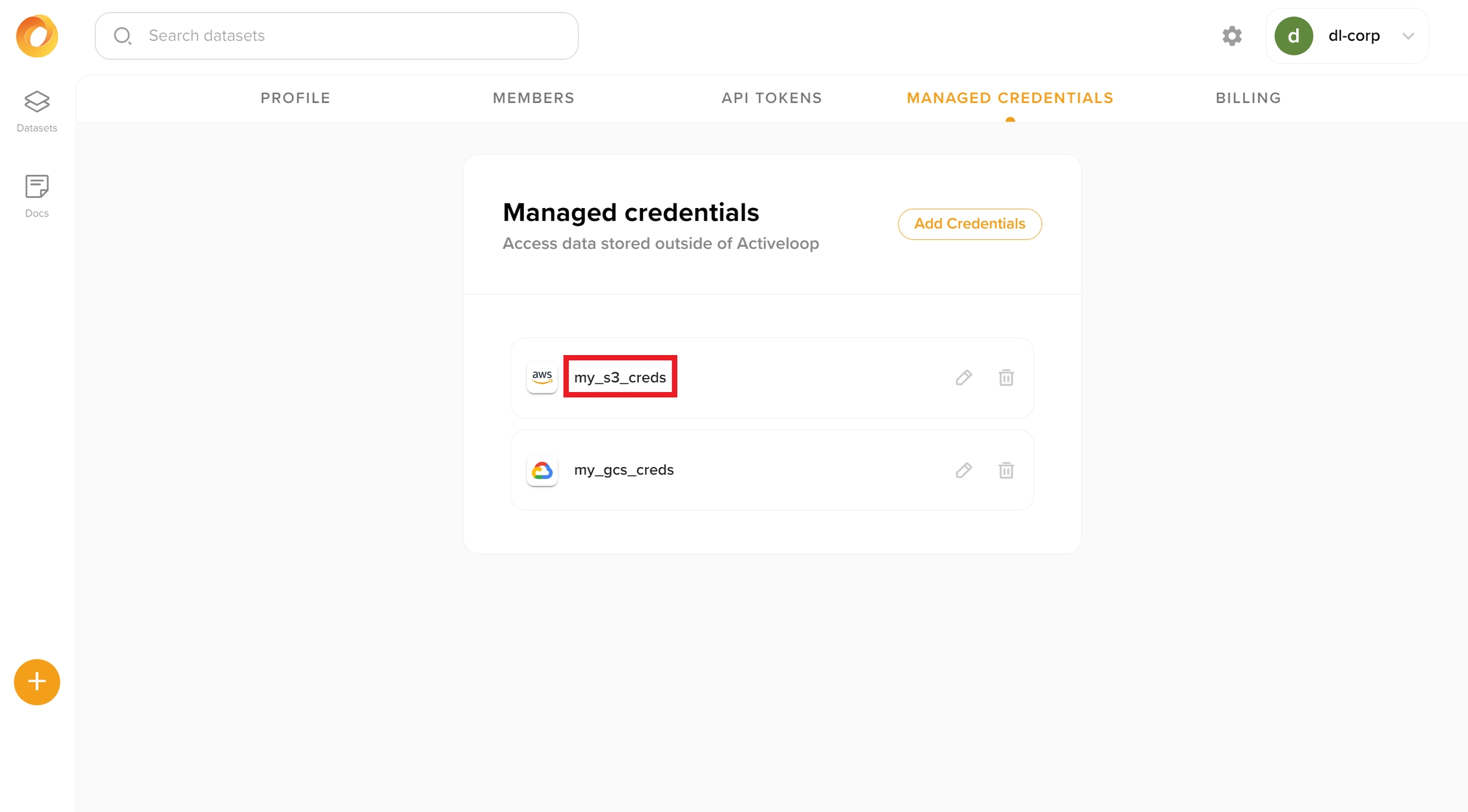 Moving on, let's create an empty Deep Lake dataset and pull managed credentials from Platform, so that we don't have to manually specify the credentials to access the s3 links every time we use this dataset. Since the Deep Lake dataset is stored in Deep Lake storage, we also provide an API token to identify the user.