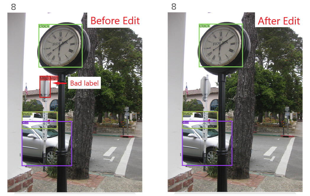 8, a road sign is labeled as astop sign, even though the sign is facing away from the camera. Even though it may be astop sign, computer vision systems should positively identify the type of a road sign based on its visible text. Therefore, let's remove the stop sign label from this image.