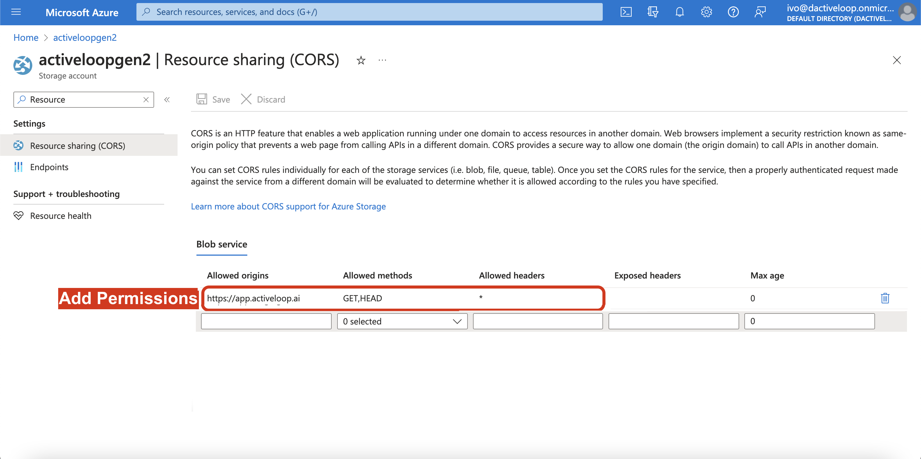 Cross-Origin Resource Sharing (CORS) is typically enabled by default in Azure. If that's not the case in your Azure account, in order to visualize Deep Lake datasets stored in your own Azure storage in the [Deep Lake app](https://app.activeloop.ai/), please enable [CORS](https://en.wikipedia.org/wiki/Cross-origin_resource_sharing) in the storage account containing the Deep Lake dataset and any source data in linked tensors.
