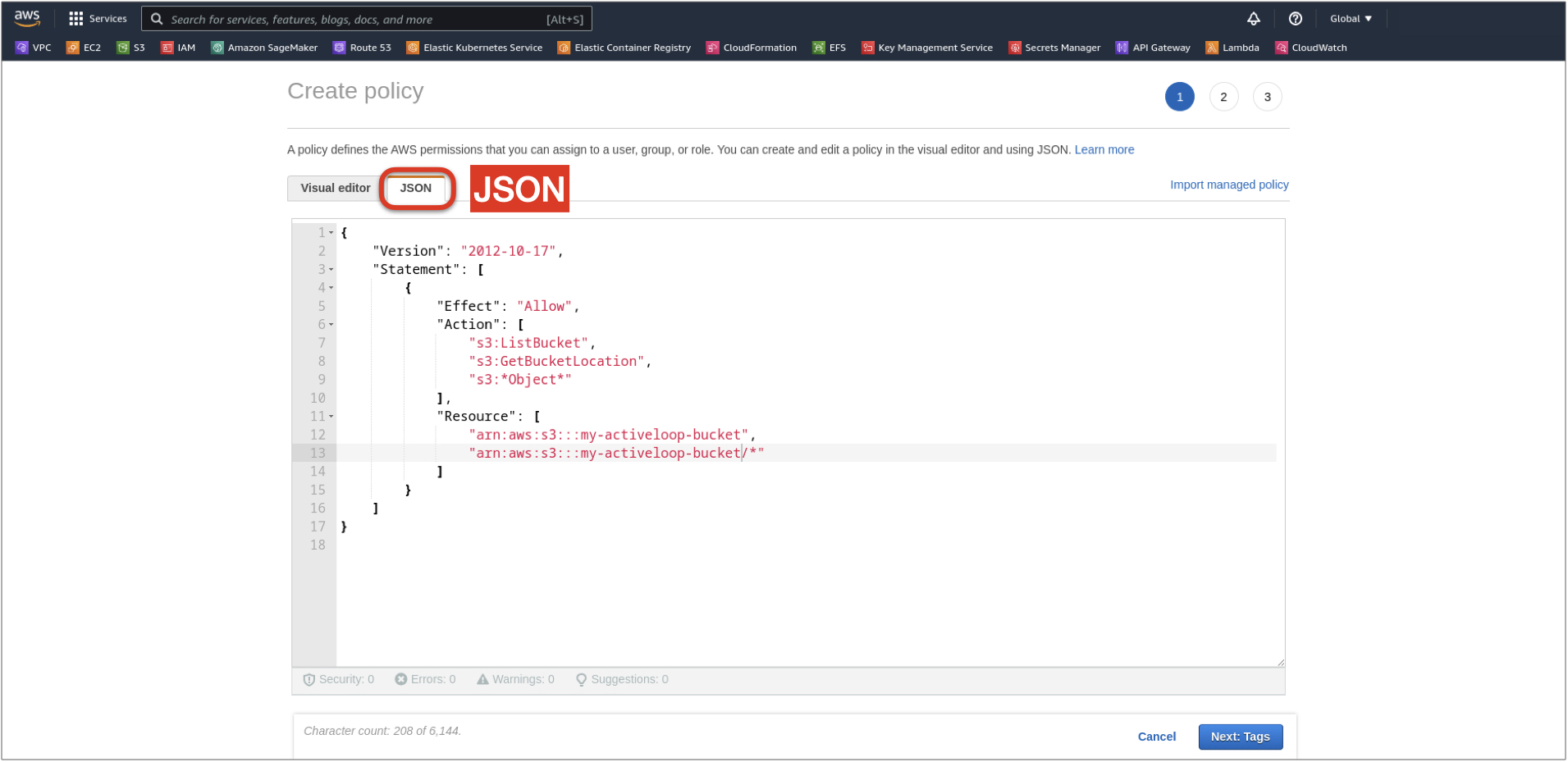 7\. On the bottom right, click `Next: Tags` (create tags if needed) and `Next: Preview`, enter the policy `name` and `description`, and click `Create policy`