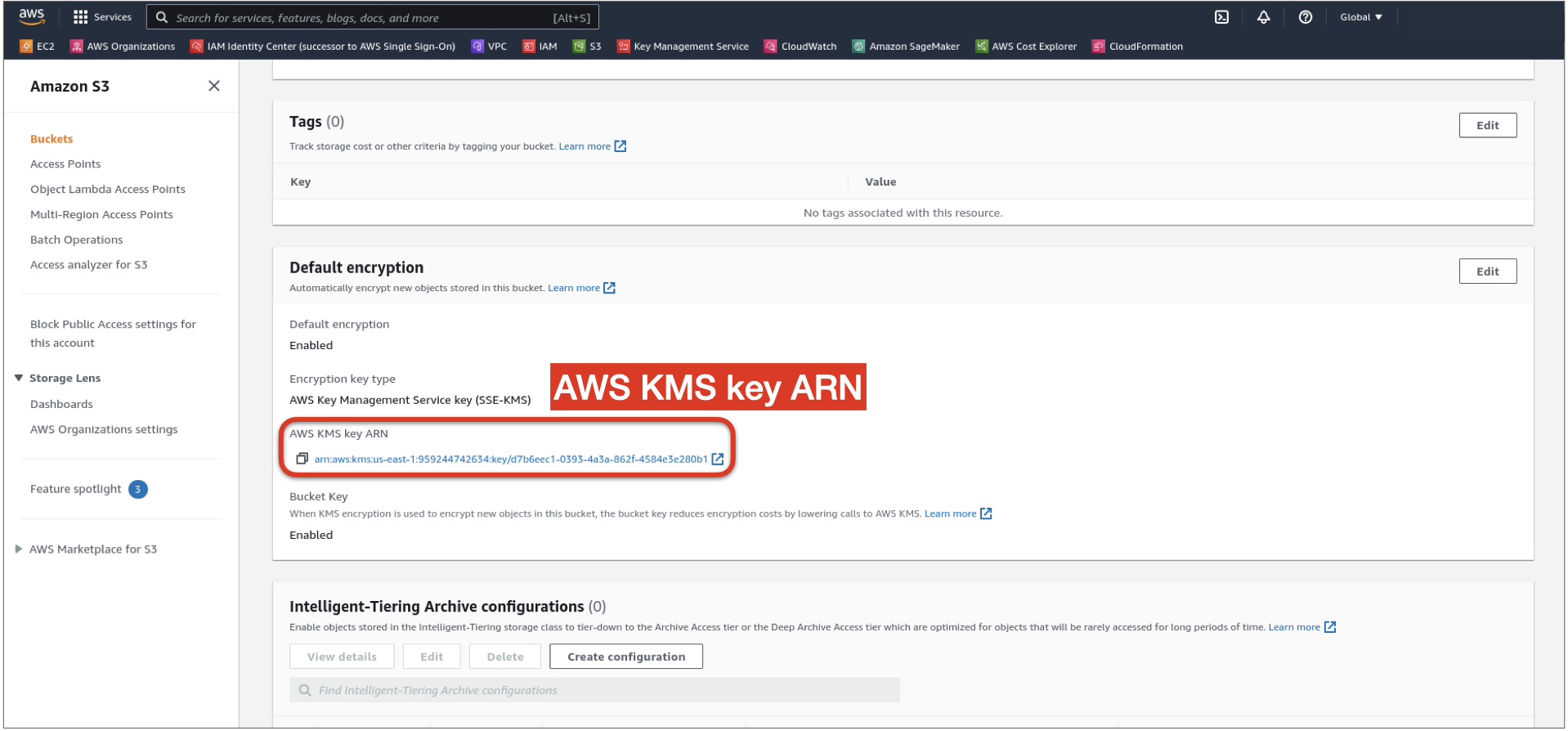 3\. Scroll down to Default encryption and copy the `AWS KMS key ARN`&#x20;